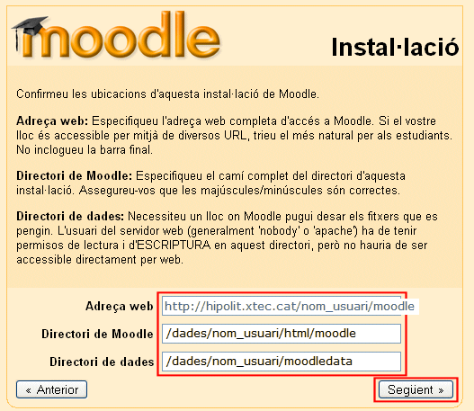 La seqüència (script) d’instal·lació del Moodle localitza automàticament el directori on es troben els fitxers i proposa una ubicació per a les dades. Per raons de seguretat, convé modificar la ubicació proposada, de manera que les dades es desin fora del directori de publicació.