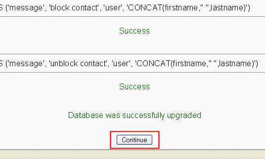 En aquest punt s’inicia el procés de creació de les taules del Moodle. Les quatre pàgines següents mostren els missatges que informen de si el procés s’ha realitzat correctament. Únicament heu d’anar al final de cada pàgina i clicar a Continue.
