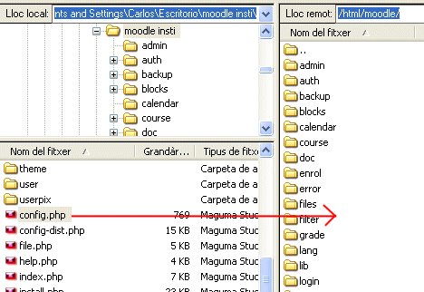 Connecteu-vos novament al servidor. Al quadre de l’esquerra localitzeu el fitxer config.php que heu descarregat i, en el de la dreta, accediu a la carpeta moodle.