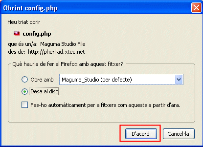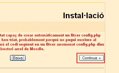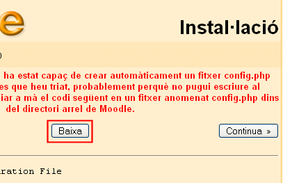 En aquest moment, la seqüència d’instal·lació intenta desar les dades que heu indicat, necessàries per a la connexió, en un fitxer anomenat config.php. Atès que el fitxer no existeix i no el pot crear, us ofereix la possibilitat de descarregar-lo perquè el pugeu manualment al servidor.