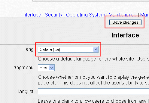 Arribareu a una pàgina on es demanen algunes dades. Canvieu, únicament, la primera de les variables, lang, i escolliu el català. Quan l’hàgiu seleccionat cliqueu a Save changes.