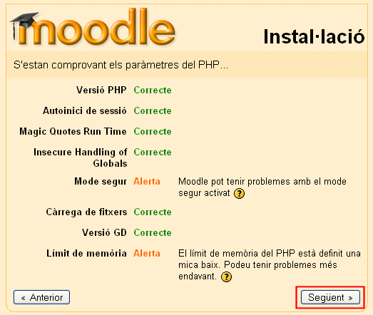 La pàgina següent comprova l’adequació de la configuració del servidor al Moodle. Cliqueu a Següent per continuar.