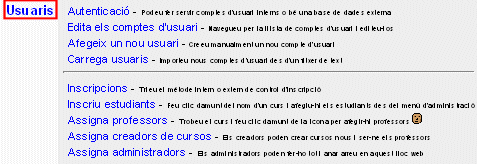 El següent apartat és el dels usuaris, on podeu escollir-hi el mètode d’autentificació, l’edició dels comptes d’usuari, afegir un usuari/ària nou, o bé carregar diferents usuaris des d’un fitxer de text. En el Moodle hi ha explicades les diverses possibilitats.