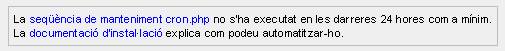 Apareix una pàgina on veureu un missatge sobre la seqüència de manteniment cron.php. Aquest fitxer s’ha d’executar regularment perquè determinades tasques de gestió interna del Moodle es realitzin correctament. Trobareu la informació corresponent als enllaços.