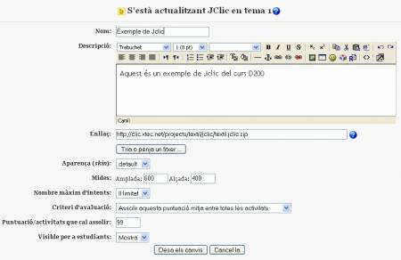 Si el JClic l’heu creat vosaltres, podeu penjar-lo com un fitxer comprimit i, en lloc de descomprimir-lo, heu d’escollir l’opció Choose(Tria) com vau fer a la pràctica 4.