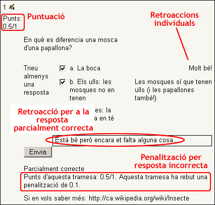 - L'estudiant selecciona una resposta parcialment correcta. En aquest cas, selecciona una de les dues opcions correctes però, a més, en selecciona també una d'incorrecta.