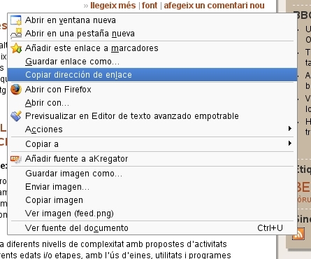 A la part inferior del bloc (al menú de la dreta), veureu que apareix la icona de sindicació. Una de les maneres de subscriure-us al canal d’informació és fer clic amb el botó dret del ratolí quan siguem sobre la icona i seleccionar l’opció Copiar la direcció de l’enllaç. Aquesta ubicació o adreça de sindicació és la que heu d’afegir al vostre lector (Reader). Cal tenir en compte que les icones de sindicació no sempre són iguals, encara que, a la fi, totes s’assemblen.