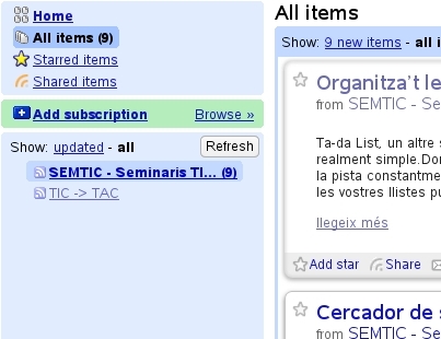 Una vegada els hàgiu agregat, veureu que Google Reader ja ha carregat els articles que hi ha publicats. En negreta i entre parèntesis, us marca els articles nous que ha carregat i que vosaltres encara no heu visualitzat.