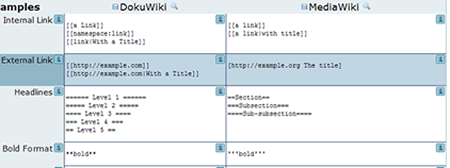 Inicialment i al llarg d’uns anys, la sintaxi era estàndard. Actualment, les instruccions de format són diferents depenent del sistema wiki usat. Els més simples permeten únicament un format de text bàsic, mentre que d’altres més complexos permeten inserció d’imatges, creació de taules i altres elements.