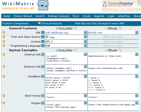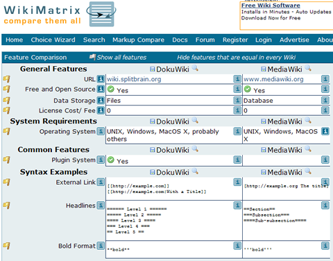 WikiMatrix és un servei que ens presenta una llarga llista de sistemes de wikis i ens permet fer comparacions entre ells. Mireu la taula següent on comparem un sistema només d’allotjament (PBwiki) amb un de codi obert (DokuWiki):