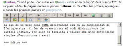 A la part superior, podem veure la barra d’icones (toolbar) que ens facilita accés ràpid a la sintaxi concreta. A sota, tenim l’espai d’edició de text. A baix de tot, trobem els botons de desar, vista prèvia o cancel·lar. Les dues fletxes serveixen per ajustar la mida de la pantalla.