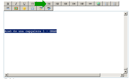 En aquest cas volem que el text aparegui com una capçalera de tipus 1 (gran). Després de clicar a la icona “H1” apareixerà etiquetat així:
