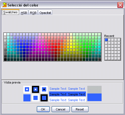 Feu clic al botó Color de fons. S’obrirà una finestra amb quatre pestanyes. Les tres primeres són per seleccionar el color. Cada pestanya correspon a una manera diferent de fer-ho: Swatches, HSB i RGB.