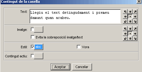 Activeu l’opció Mostra aquest text. Introduïu el text de l’exercici de la mateixa manera com ho heu fet abans: seleccioneu el text en pantalla (el teniu ja en el JClic Autor) amb la combinació de tecles Control+C, col·loqueu el punter del ratolí dins el requadre que espera l’entrada del text i premeu Control+V. Seleccioneu el mateix estil que el que teniu: font (Courier New), mida (16), fons (blanc).