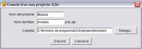 Amb el JClic Autor creeu un nou projecte. Aquesta vegada anomeneu-lo Mòduls. Es crearà a la carpeta C:\Archivos de programa\JClic\projects\moduls