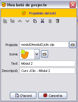 A la finestra Nou botó de projecte, cerqueu el projecte modul3.jclic.zip, amb el botó