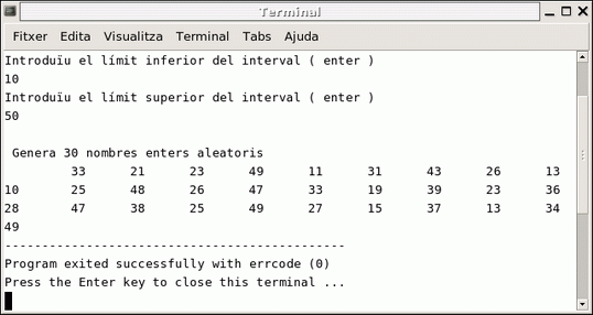 Demaneu el límit inferior i el superior de l'interval i obtindrem 30 nombres enters aleatoris inclosos els límits. Creeu un nou arxiu font C anomenat m4p06.c. i escriviu el següent codi: