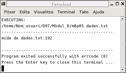 En primer lloc implementarem una funció mida() que ens donarà la mida en octets d'un arxiu de disc. Això es farà amb ajuda de les funcions fseek() i ftell(). Creeu un nou arxiu del tipus C++ anomenat m8p05.cc i escriviu el següent codi: