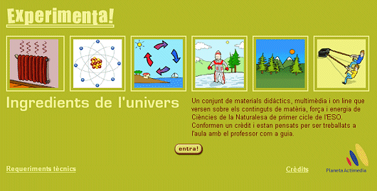 En aquesta pràctica us fixareu en un d'aquests materials, el que porta com a títol Experimenta!, concretament la unitat on es desenvolupen els continguts relacionats amb les mescles. En utilitzar aquest recurs, cal tenir en compte que està restringit per a usuaris de la XTEC i de l'edu365.