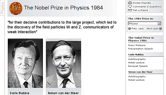 També podeu treballar aquesta part amb la pàgina dels premis Nobel de física. Si aneu baixant i us atureu a l’any 1984, observareu que hi ha dos premiats: Carlo Rubbia i Simon van der Meer. La pàgina indica el motiu de la concessió del Nobel. En aquest cas, pel treball experimental que va portar al descobriment de les partícules W i Z, responsables de la interacció dèbil.