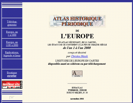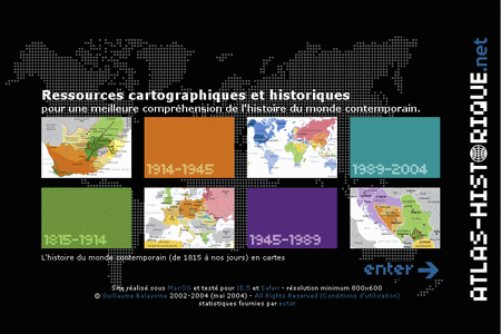 Destaquen especialment la digitalització completa del Cambridge Modern History Atlas de 1912, l'Historical Atlas de William Sheperd de 1923-1926 o el Public Schools Historical Atlas de C. Colbeck, de 1905, atles interessants també com a mostra dels atles històrics d'altres èpoques: Destaquem també la relació d'enllaços a d'altres llocs amb mapes històrics: http://www.lib.utexas.edu/maps/map_sites/hist_sites.html Una altra bona font de mapes històrics és la inclosa a la web d'Hyperhistory: És una web molt interessant per apropar-nos a la història dels primers mapes i a la visió del món que reflectien a l'antiguetat (amb molt bons comentaris): Si el que voleu és un atles històric amb l'evolució d'Europa, segle a segle (des del segle I fins al XX), visiteu la web següent: Un atles sobre el món contemporani el trobareu en aquesta web: També podeu accedir a la cartoteca del CNICE: |