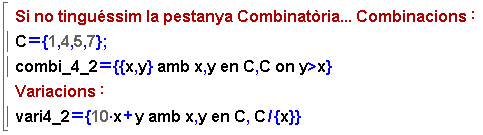 Per acabar aquesta pràctica, veureu en la finestra activa corresponent uns darrers blocs de comandes que permeten generar noves llistes a partir d'altres de ja existents (per adjunció de les llistes globalment, per supressió d'elements, per adjunció d'elements individuals, etc.) i comprovareu que en la definició de les llistes podem fer servir les variables auxiliars per definir el conjunt a què ha de pertànyer una altra variable auxiliar.