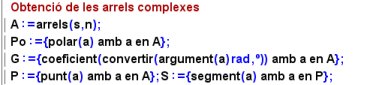 Ara ha arribat el moment d'estudiar amb detall el codi d'aquest exemple. Veurem la creació de llistes amb l'ajut de amb..en per a la generació d'objectes sofisticats que després dibuixarem; a més, incorporarem dos desplaçadors per a triar el nombre complex i l'índex de l'arrel. Amb la icona de l'esquerra podeu obrir una finestra activa amb el codi