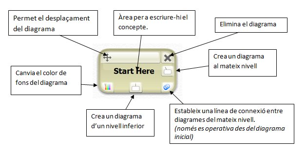 c) En situar el cursor del ratolí damunt el diagrama inicial apareixen tot un seguit d’opcions que permeten començar a elaborar el mapa conceptual:
