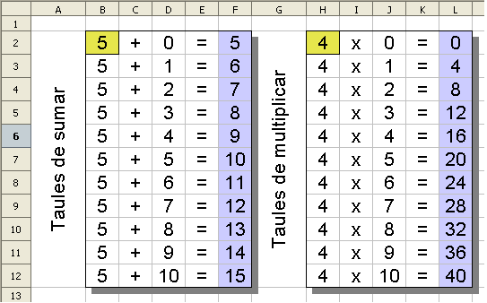- Reproduïu, en el primer full, les taules de sumar i multiplicar tal com veieu en la següent figura