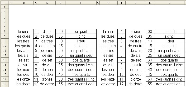 Aquest full servirà de suport per poder fer l’activitat en un nou full. En escriure el que s’indica en aquest gràfic, cal tenir en compte que cal afegir un espai després del que s’escriu en cada una de les cel·les del rang B7:B18 a les quals fa referència aquest gràfic. Així doncs, quedaria “la una_”, “les dues_” … L’espai estaria representat, que no escrit, pel guió en posició baixa.