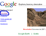 Cliqueu a sobre de l’apartat dedicat al món. De les diferents possibilitats que ofereix, trieu la segona, Google Earth, cliqueu a sobre i anireu directament a la pàgina de descàrregues : http://earth.google.com/ . Aquest és un programa en constant evolució, amb una interfície molt intuïtiva que permet navegar d’un extrem a l’altre del planeta amb una gran facilitat. Per poder-lo utilitzar és necessari estar connectat a Internet ja que les imatges es descarreguen en línia, però anem pas per pas. Cliqueu a sobre de descàrregues, situat a l’esquerra de la pantalla.