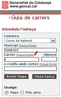 Per dur a terme aquesta pràctica, feu servir un altre sistema, per a elaborar la llista de carrers, utilitzeu l’adreça electrònica de l’Institut Cartogràfic de Catalunya. http://mercuri.icc.cat/website/mob_nf/mob1/mob2/inici2.htm. Es tracta d’una guia de carrers de tot Catalunya. A la part esquerra de la pàgina, hi ha un formulari que permet trobar la situació d’un lloc a partir de l’adreça postal.