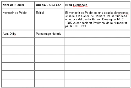 Una cop feta aquesta presentació, els alumnes comencen l’activitat. Primer elaboren la llista de carrers sobre els quals treballaran. Fan una posada en comú, amb la resta de la classe, per tal que no hi hagi repeticions. Després indiquen el concepte del qual es tracta i fan un breu resum, per això utilitzaran les enciclopèdies on line. També cercaran imatges i les tractaran amb un programa informàtic d’edició d’imatges.