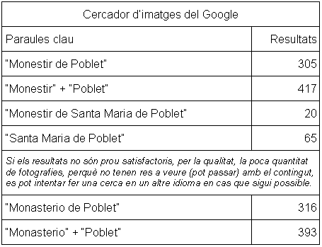 hi escriureu el nom exacte del carrer, per exemple: “Monestir de Poblet”, entre cometes, d’aquesta manera la cerca serà exacta. La xifra d’imatges trobades pot variar, es tracta que hi feu un cop d’ull, i trieu la imatge més adient segons les intencions de l’activitat i que tingui una certa qualitat.
