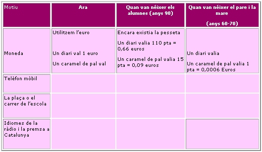 Amb el projector i un ordinador, podeu obrir el processador de textos i en una taula de quatre columnes, com la de més avall, anotar les diferències de diversos aspectes de la vida quotidiana i de l’entorn: la moneda, els telèfons mòbils, algun indret proper conegut, algun aspecte social o els models i formes dels vehicles…
