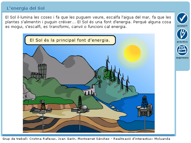 El treball per grups és fonamental en aquesta activitat. En algun moment, haureu de combinar el treball en grup i la posada en comú o exposició dels resultats, i establir un diàleg entre tots. Repartiu a cada grup una cartolina on heu escrit una pregunta. Us en proposem algunes i vosaltres, veient les propostes que us hem mostrat anteriorment relacionades amb l’aigua i l’energia, podeu completar: