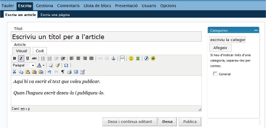 Per a escriure una entrada escolliu l’opció “Escriu” del menú. Poseu un títol i escriviu l’article.