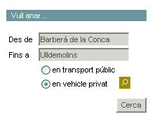 Després d’haver introduït el nom d’ambdós municipis, s’escull com es vol fer l’itinerari: en transport públic o bé en transport privat (en aquest cas per les característiques de l’itinerari s’opta pel vehicle privat). Una cop s’ha optat, es prem Cerca.