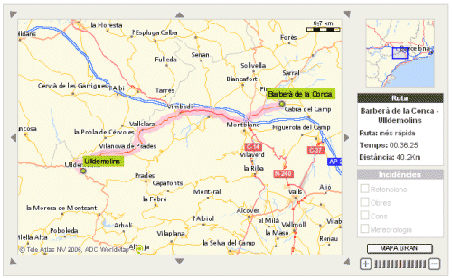 Primer calculeu la distància en línia recta des de Barberà de la Conca fins a Ulldemolins. Per realitzar aquest càlcul preneu com a referència el mapa 1:250.000, feu la cerca “Barberà de la Conca” i realitzeu un zoom out per allunyar la visualització; d’aquesta manera les dues poblacions quedaran dins l’àrea mostrada pel mapa.