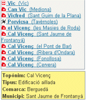 Sota el llistat de topònims hi ha un requadre d’una tonalitat ocre que us informa del topònim que heu seleccionat: s’inclou el nom del topònim, el tipus, la comarca on es troba i el municipi al qual pertany.