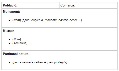 Els alumnes de la classe formaran tants grups com municipis hi hagi al llarg de l’itinerari. L’objectiu final és que cada grup realitzi una fitxa amb els atractius turístics de cadascuna de les poblacions de l’itinerari.